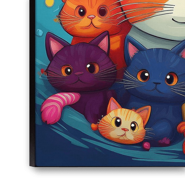 Nahaufnahmen von Katzenköpfen füllen das Werk.