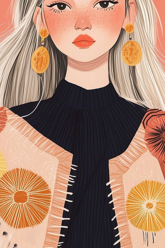 Eine stilvolle Frau strahlt selbstbewusste sommerliche Eleganz vor einem warmen orangefarbenen Hintergrund aus. Ihr langes, blond-graues Haar fällt locker über ihre Schultern und bildet einen sanften Kontrast zu dem schwarzen Oberteil und dem leuchtend orangefarbenen Rock. Große goldene Ohrringe fangen das Licht auf subtile Weise ein und verleihen ihrem entspannten, aber auffälligen Look einen Hauch von Glamour.