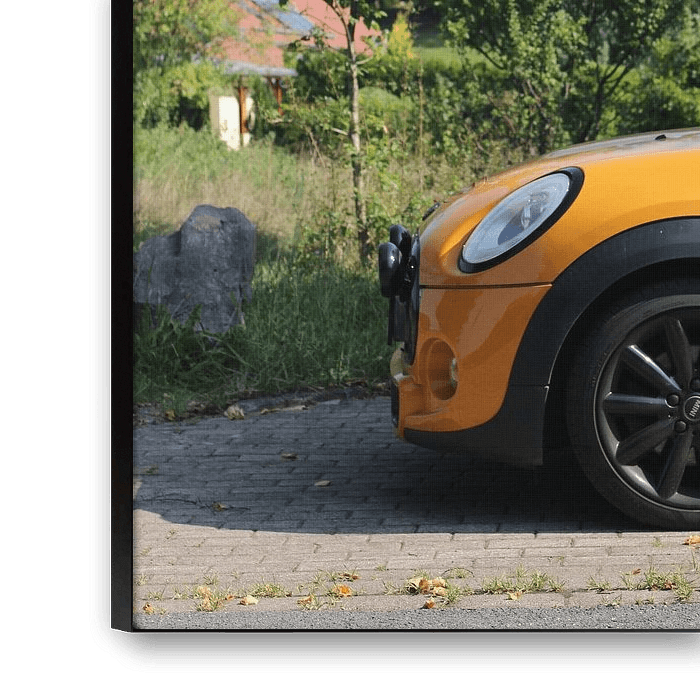 Vor einer bewaldeten Landschaft sieht man die Front eines Mini Cooper. Die Farben sind sehr sommerlich, der Himmel ist wolkenlos blau.