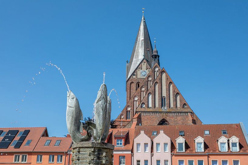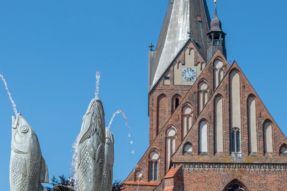 Dieses außergewöhnliche Foto des historischen Springbrunnens auf dem Marktplatz von Barth rückt die kunstvollen Fischfiguren eindrucksvoll in den Mittelpunkt. Im Vordergrund dominieren ihre detailreich gestalteten…