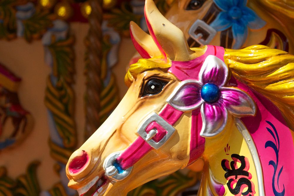 Queens Walk is de boulevard in Londen waaraan ook reuzenrad "The London Eye" ligt. De draaimolen aan deze route is gevuld met vrolijk gekleurde paarden. Elk paard heeft een eigen naam. Dit is Louise.