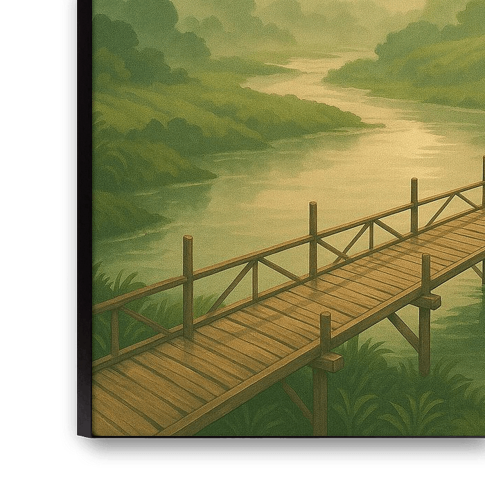 Im Vordergrund spannt sich eine lange Holzbrücke über einen ruhigen Fluss, die den Betrachter in die Landschaft einlädt. Die einfache Konstruktion und die natürlichen Texturen spiegeln den rustikalen Charme von Pai wider, wo langsames Leben und friedliche Natur nahtlos ineinander übergehen. Der Fluss schlängelt sich anmutig durch das Tal, spiegelt das sanfte Licht der Morgendämmerung wider und verleiht der ansonsten ruhigen Umgebung ein Gefühl von Bewegung.