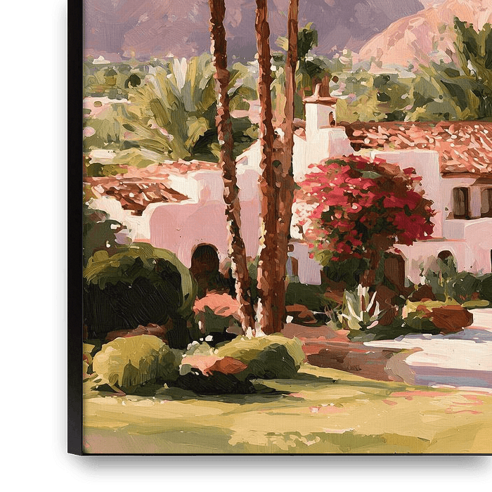 Retro-Villa zwischen Palmen in sanften Rosatönen. Eine Mischung aus kalifornischem Traum und Boho-Luxus, voller Sonne und Stil.