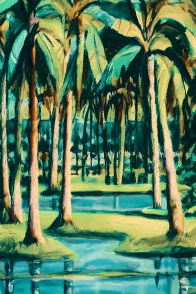 Palmen am Wasser in Türkis wurde digital erstellt. Gestaltung: Porträt.