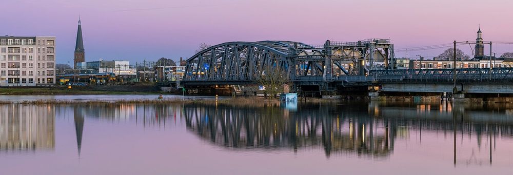 Panoramafoto auf der IJssel bei Hochwasser während der blauen Stunde.