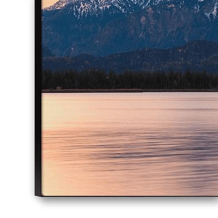 Im stillen Wasser des Sees spiegeln sich die goldenen Farbtöne der aufgehenden Sonne, umgeben von sanften Herbstfarben und eingerahmt von den schneebedeckten Gipfeln der bayerischen Alpen.