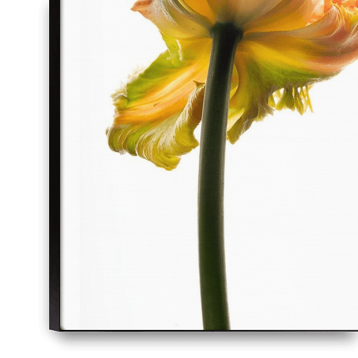 Diese ausdrucksstarke Innenraumfotografie zeigt eine orangefarbene Sittich-Tulpe in voller Blüte, die in einer minimalistischen Komposition vor einem hellen Hintergrund aufgenommen wurde. Die gewellten Blütenblätter und die leuchtenden Farbtöne verleihen dem Bild einen skulpturalen, fast abstrakten Charakter. Als Wandkunst bringt diese…