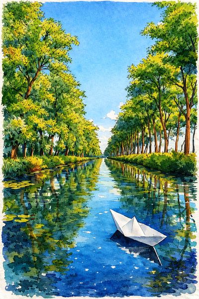 Dieses stimmungsvolle Landschaftsgemälde zeigt einen idyllischen Sommertag an einem ruhigen, von Bäumen gesäumten Wasserweg. Ein kleines weißes Papierboot treibt auf dem klaren blauen Wasser, umgeben von leuchtend grünen Bäumen und sonnenbeschienenen Blättern. Die detaillierten Reflexionen in der ruhigen Wasseroberfläche verstärken das…