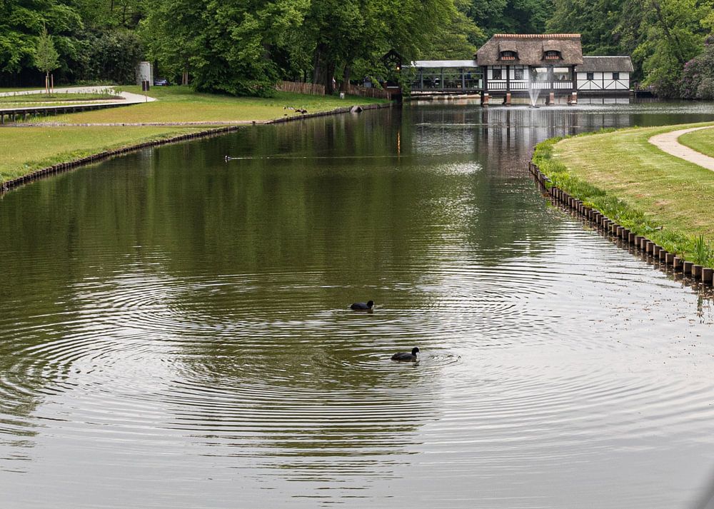 Diese Aufnahme des Bootshauses im Hintergrund wurde von der Brücke am Teich aus gemacht.