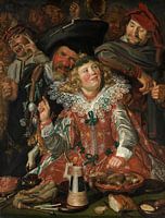 Die Fastnacht, heute besser bekannt als Karneval, ist die traditionelle Zeit der vorfastenzeitlichen Verwöhnung und Selbstdisziplin. Jahrhundert war sie auch der Anlass für Theateraufführungen der Malerzunft. Hier zeigt Hals zwei Stockfiguren aus diesen Stücken, Hans Worst mit einer Wurst, die an seiner Mütze baumelt, und Pekelharing, der einen Kranz aus gesalzenem Fisch und Eiern trägt. Sie flankieren ein reich gekleidetes Mädchen (wahrscheinlich ein schleppender Junge, denn Frauen durften bei diesen Gelegenheiten nicht auftreten). Im Vordergrund stehen Stillebenelemente, die sowohl an die traditionelle Küche des Festes als auch an eine Fülle erotischer Anspielungen erinnern.