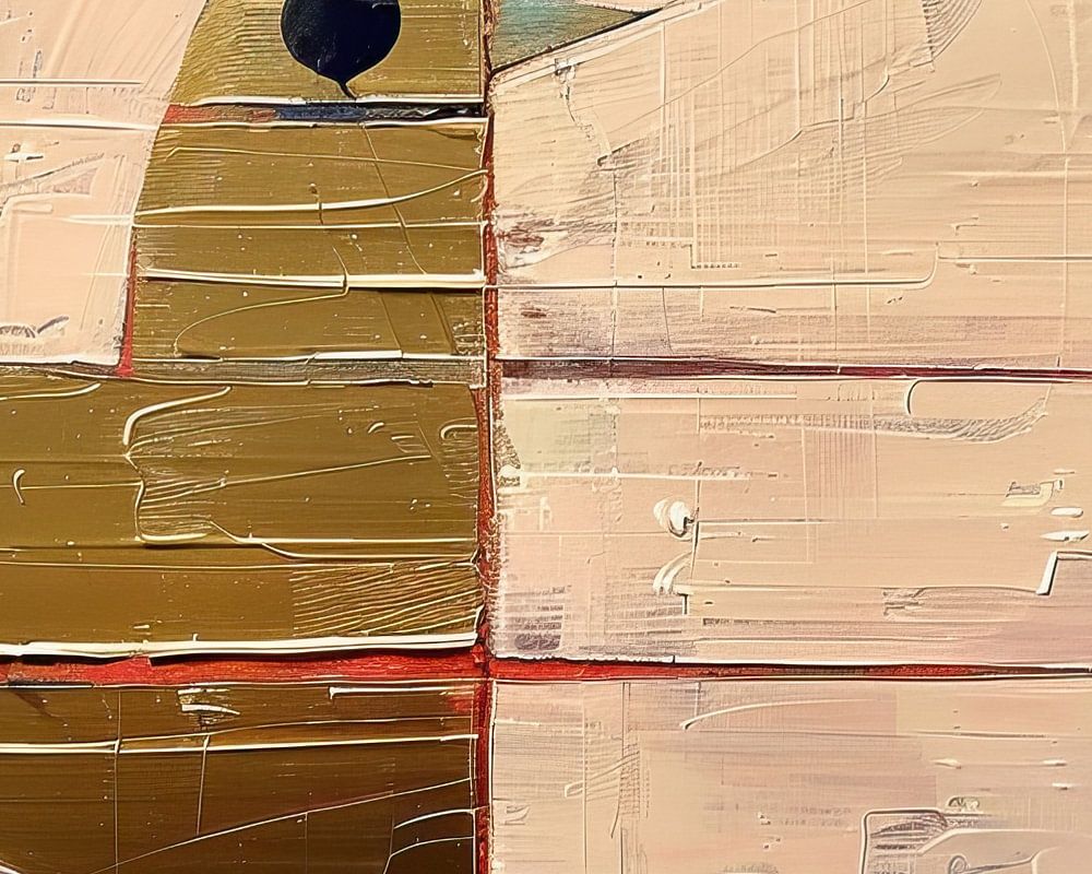 Pastellpanorama eines Vogels - Dieses abstrakte Vogelgemälde ist eine spielerische und moderne Darstellung eines Vogels, die aus klaren, geometrischen Formen besteht. Im Mittelpunkt des Werks steht eine große, stilisierte Figur, die einen Vogel darstellt, der durch einen markanten, runden Kopf in Schwarz und einen massigen, geschichteten Körper in Braun- und Beigetönen gekennzeichnet ist. Der Hintergrund des Gemäldes ist in rechteckige Blöcke unterteilt und besteht aus einer reichen Palette von Pastelltönen wie Hellblau, zartem Rosa und subtilen Gelbtönen. Dieser weiche, aber lebendige Hintergrund steht in starkem Kontrast zu der kräftigen Gestalt des Vogels. Rote und rosafarbene Linien zeichnen die Umrisse des Tieres nach und erwecken den Eindruck eines Gitters oder Käfigs.