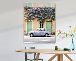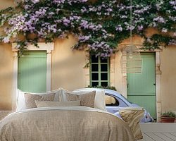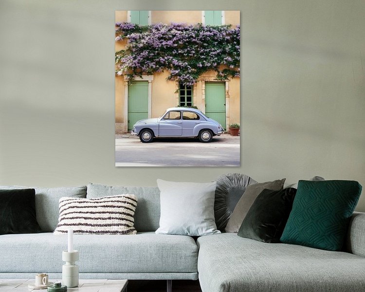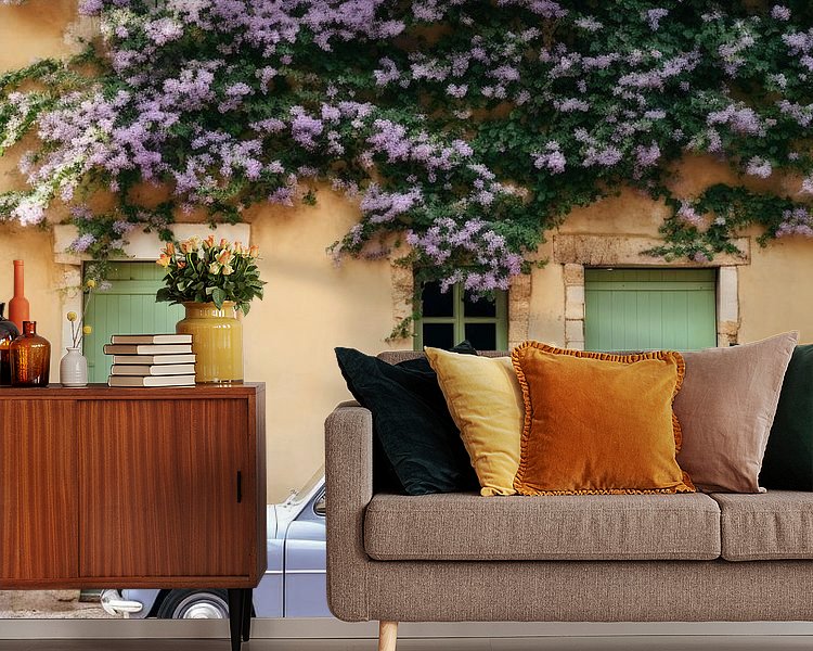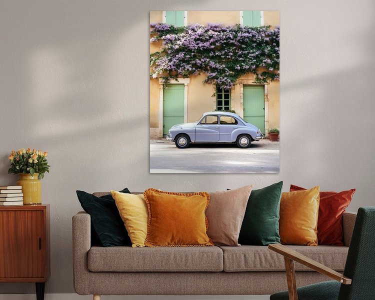 Es ist ein Bild von heiterer Schönheit, bei dem die sanfte Pastellfarbe des Autos nahtlos mit der weichen Fassade des traditionellen Hauses verschmilzt. Die grünen Fensterläden bilden einen subtilen Kontrast zu den fliederfarbenen Blüten, die sich üppig über die Wand erstrecken und eine lebendige und doch ruhige Komposition ergeben. Der Duft blühender Blumen erfüllt die Luft, und die Stille wird nur durch das Pfeifen der Vögel und das sanfte Rascheln der Blätter unterbrochen.