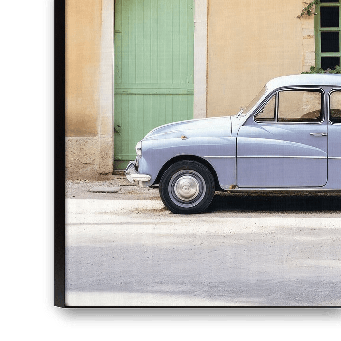 Im Herzen eines rustikalen Dorfes parkt ein verschnörkelter Renault Dauphine, ein Klassiker, der die Zeiten und Trends überdauert hat.