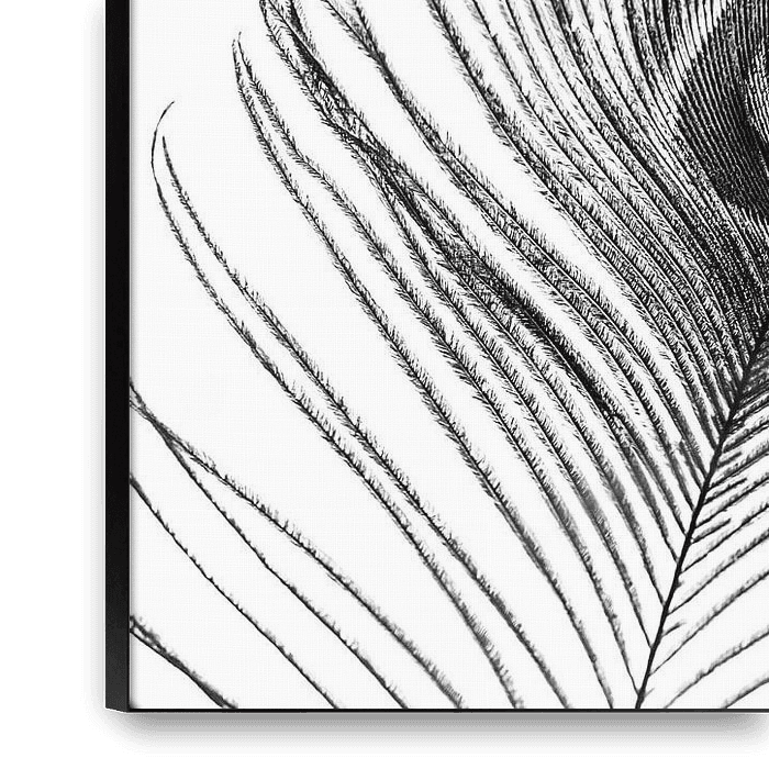 De veer van de pauw in het zwart-wit leidt ons tot de essentie van de veer. Krachtig in de kern. Abstract portret van een veer van de pauw. Witte achtergrond brengt rust in deze perfecte wanddecoratie.