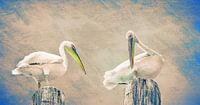 Pelikane an einem Mast in der Nähe von Walvis Bay, Namibia. Pelikane (Pelecanidae) sind eine Familie von Wasservögeln, die für ihr markantes Aussehen, ihre Größe und ihr Verhalten bekannt sind. Die Familie hat acht Arten. Digitales Finishing.