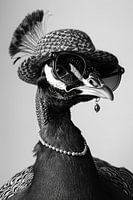 Monochrome Aufnahme eines Pfau in einem stilvollen Hut mit Feder und einer runden Brille. Perfekt für Kunst und Tiere.