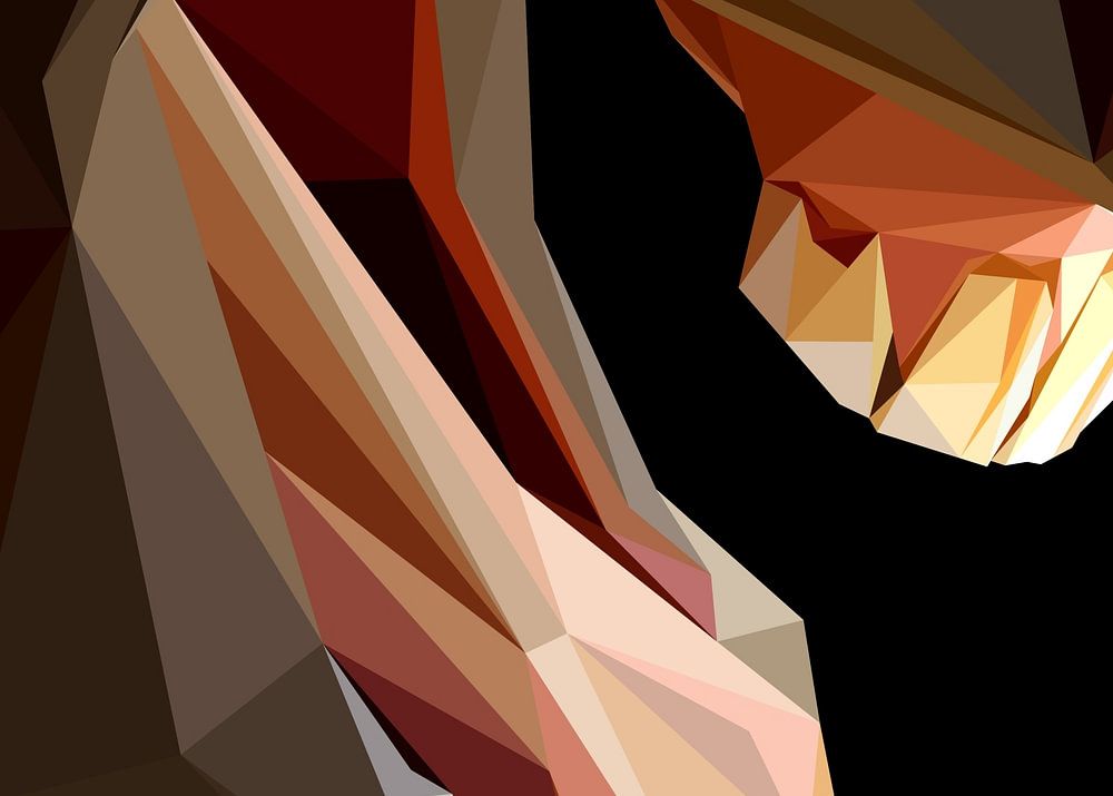 Abstrakte Illustration von Tieren, Pferd zeigt Zähne und Zunge lustigen Ausdruck, extrem nah mit schwarzem Hintergrund und Low-Poly abstrakte Illustration Stil