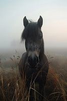 Porträt eines einsamen schwarzen Pferdes im nebeligen Feld bei Sonnenaufgang mit sanftem Blick.