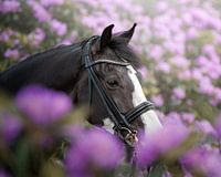 Superschöner Pferdekopf umgeben von Rhodondendron.