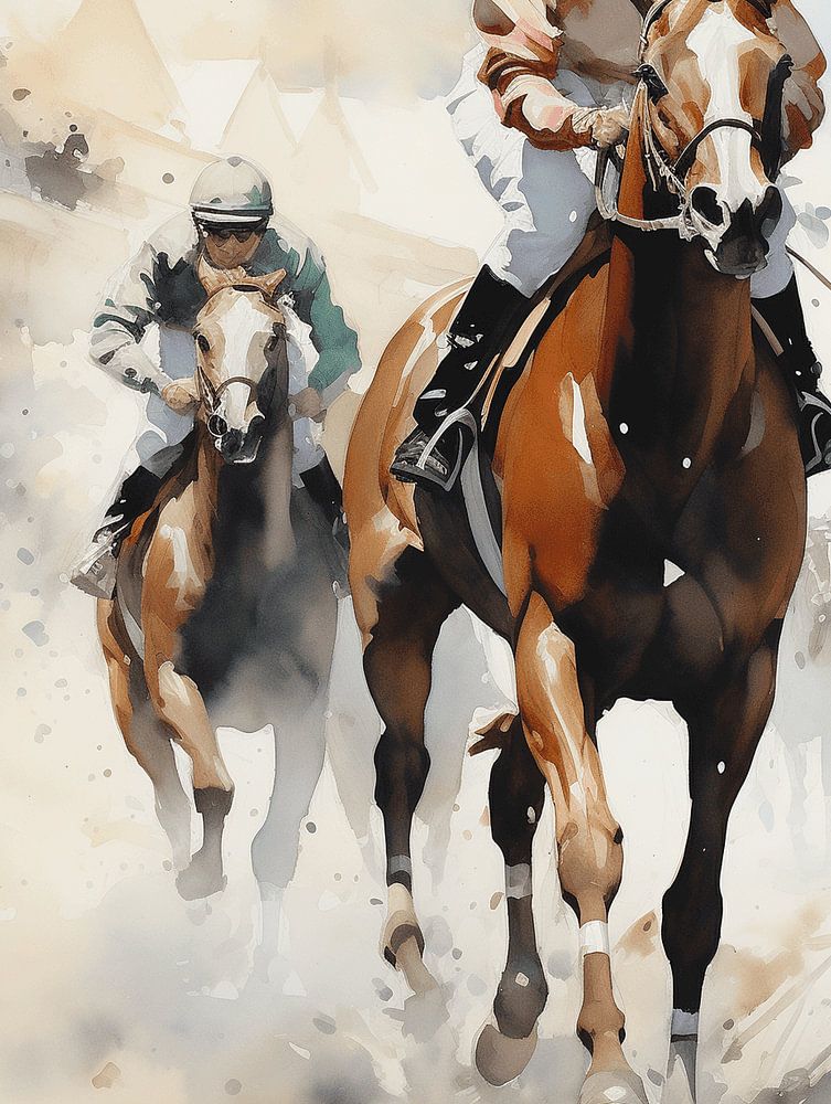 Dieses dynamische Aquarell fängt die Aufregung eines Pferderennens in einem flüchtigen, impressionistischen Stil ein. Im Vordergrund galoppieren Pferde mit ihren Jockeys in voller Aktion, wobei der vorderste Reiter in einem roten Helm und hellrosa Trikot besonders hervorsticht. Die Bewegung wird durch aufspritzenden Staub und verschwommene Linien kunstvoll dargestellt. Im Hintergrund sind weitere Rennteilnehmer und die schemenhaften Umrisse der Tribünen zu erkennen, alles in zarten, verwaschenen Tönen gehalten. Der Himmel zeigt leichte Wolken und trägt zur lebendigen, aber ätherischen Atmosphäre bei. Das Gemälde vermittelt ein Gefühl von Geschwindigkeit, Energie und der Schönheit des Moments.