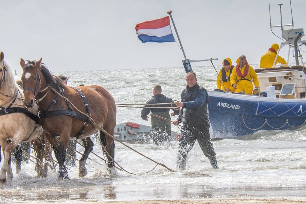 Ein schöner Eindruck von der Vorführung des Pferderettungsbootes Ameland. Mit der Kraft von zehn Pferden wird das Rettungsboot Abraham Fock auf authentische Art und Weise ins Meer gezogen. Die Demonstration lockt jeden Monat viele Besucher an den Strand auf der Wattenmeerseite von Ameland.