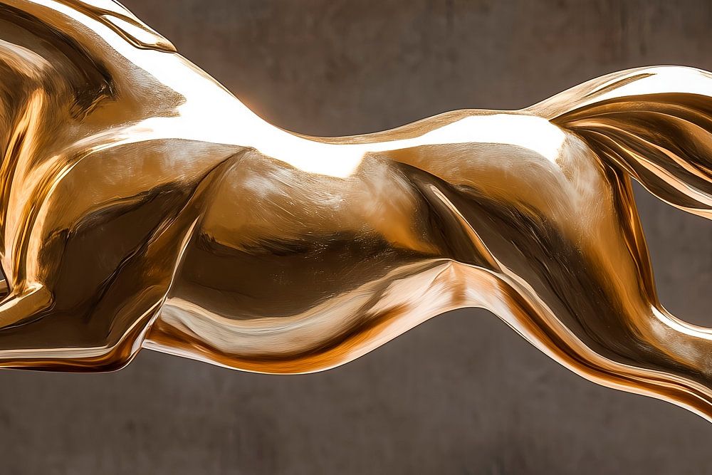 Ein Kunstwerk, das die Essenz der Kraft und der dynamischen Bewegung eines Pferdes in einer minimalistischen und doch kraftvollen Darstellung in einer Goldversion einfängt.