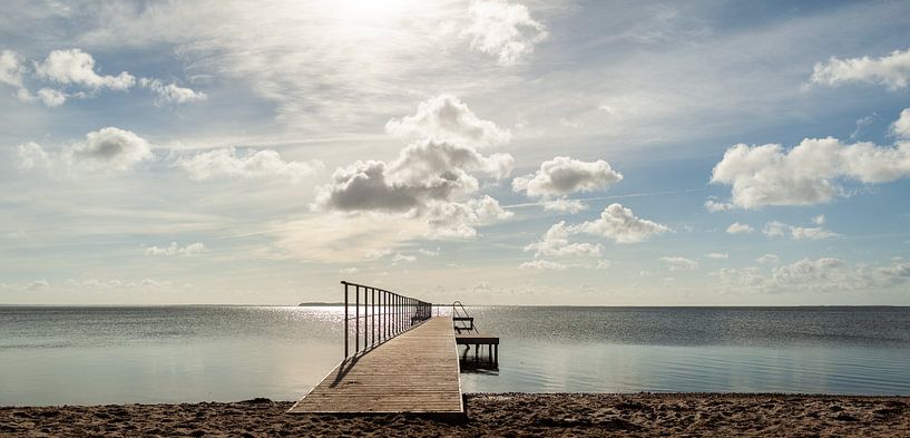 Der Pier und die heitere Ruhe des dänischen Wassers. Am frühen Morgen wirkt dieser einsame Pier unter dem sommerlich blauen Himmel, begleitet von kleinen, freundlichen Wolken, wie ein herrlicher Ort der Ruhe in einer chaotischen Welt.