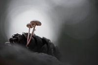 Zwei Pilze wachsen aus einem Kiefernzapfen. Dieses Foto wurde in Schwarz-Weiß konvertiert, wobei das Hauptmotiv selektiv eingefärbt wurde (Rottöne).