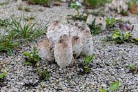 full frame shot of a set of mushroom fungi on a pebbled ground