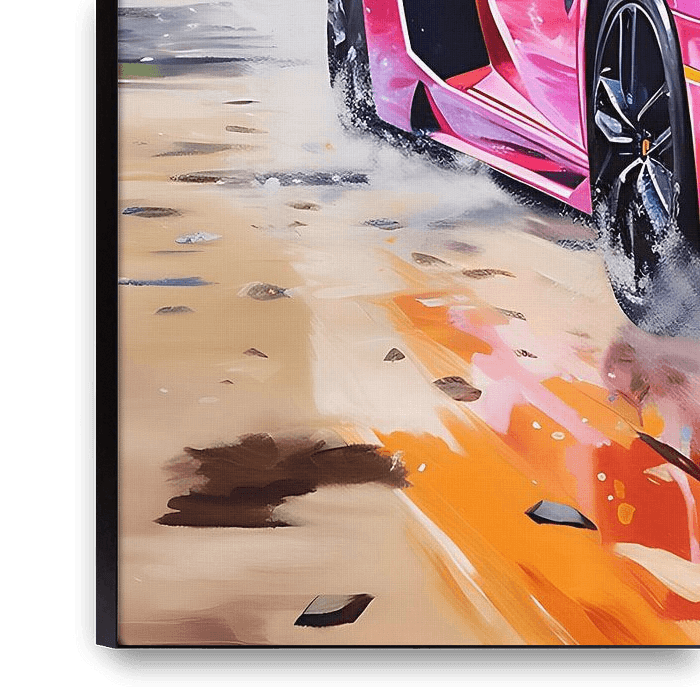 Bestelle diese Malerei Pink Lamborghini unter Palmen, Acryl von ColorWorldwide als Reproduktion auf Leinwand, Alu-Dibond, als Poster, Fototapete oder Acrylglasbild.