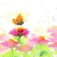 Über „Pinkfarbene Zinnien und Schmetterling“ von Karen Kaspar