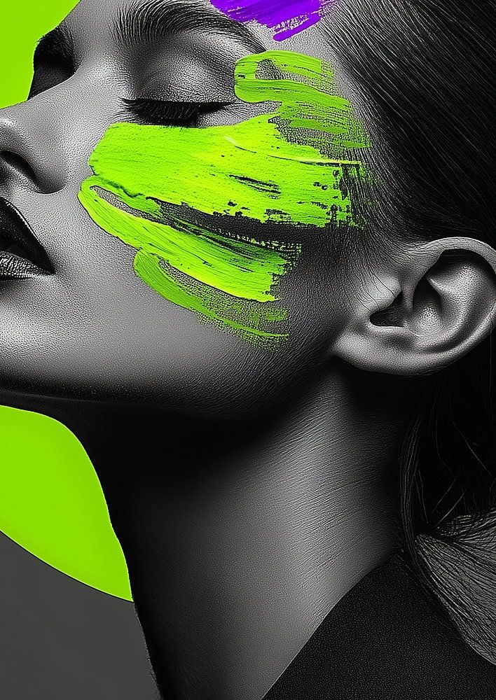 Eine Schwarz-Weiß-Fotografie einer eleganten Frau, deren Gesicht mit Pinselstrichen in Lindgrün und Violett subtil akzentuiert und in einem minimalistischen Stil ausgeführt ist. Hinter ihrem Kopf schwebt ein weicher lindgrüner Kreis, der einen ruhigen und harmonischen Hintergrund bildet und der Komposition einen Hauch von Frische und Raffinesse verleiht. Die Kombination der monochromen Fotografie mit den lebhaften Pinselstrichen und dem zartgrünen Kreis schafft einen modernen Kontrast, der die Schlichtheit des Bildes unterstreicht und gleichzeitig einen Hauch von Farbe und Ausdruck verleiht.