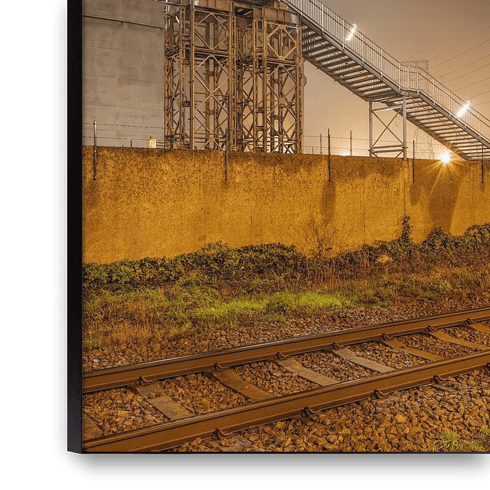 Bestelle das Foto Pipleline Brücke über Straße im Industriegebiet in der Nacht, Antwerpen von Tony Vingerhoets als Reproduktion auf Leinwand, Alu-Dibond, als Poster, Fototapete oder Acrylglasbild.