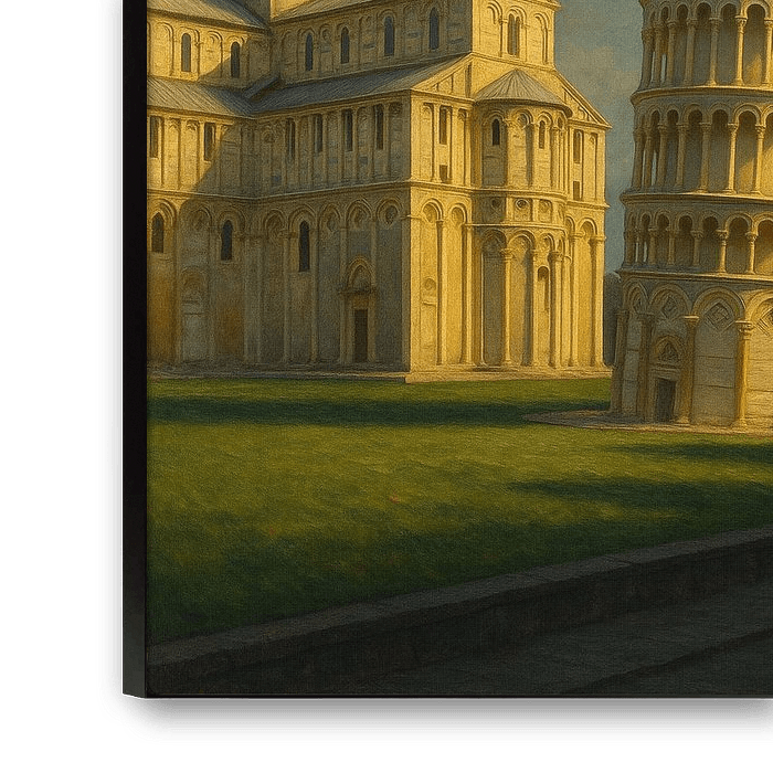 Dieses Kunstwerk verwandelt eine ikonische Ansicht in eine Szene von stiller Intimität. Die Erhabenheit der Geschichte trifft auf die Zartheit des Lichts. Die berühmte Neigung des Turms wirkt fast menschlich - unvollkommen, beständig, anmutig in seinem Ungleichgewicht.