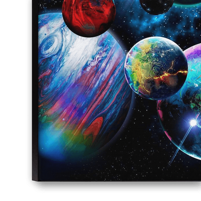 Eine hypnotisierende und chaotische Ansammlung von abstrakten, farbenfrohen Planeten und Ringen vor einem dunklen Sternenhintergrund.
