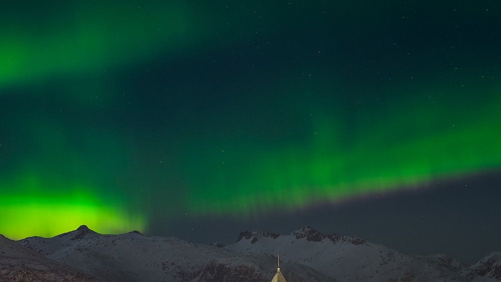 Polarlicht über der Stadt Svolvaer auf den Lofoten Inseln in Norwegen im Winter mit schneebedeckten Bergen