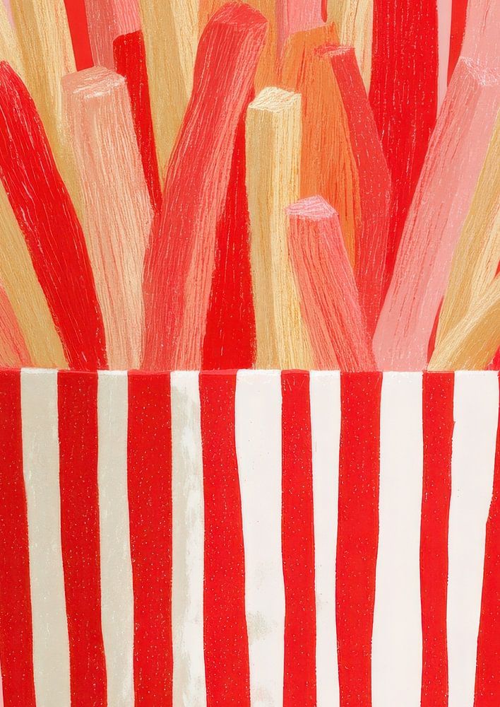Ein Gouachebild zeigt Pommes in einem rot-weiß gestreiften Pappbecher vor einem gemusterten Hintergrund. Die Komposition ist minimalistisch, mit klaren Formen, einfachen Details und kräftigen Farbbereichen. Der Stil erinnert an Mid-Century Modern Design und die Arbeiten von Marjorie Sessler, wobei geometrische Elemente und klare Konturen betont werden. Die reduzierte Darstellung kombiniert verspielte Farbigkeit mit grafischer Klarheit und erzeugt eine harmonische Balance zwischen Muster, Form und Farbe. Das Bild wirkt schlicht, ästhetisch und inspiriert durch die Verbindung von Retro-Design und moderner Illustration.