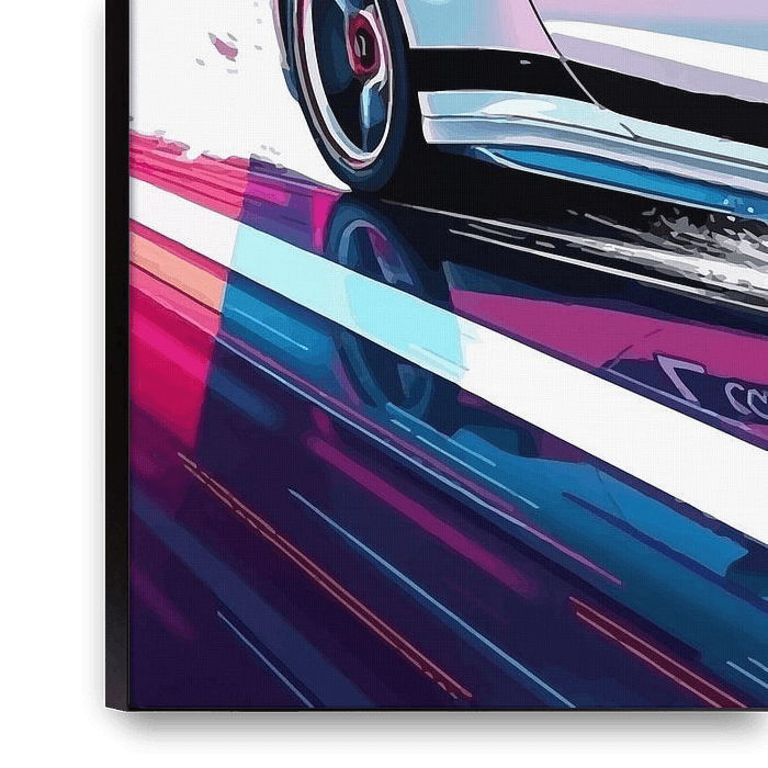 Die Illustration des Porsche 911 GT3 RS zeigt den Wagen, der durch eine neonbeleuchtete Cyberpunk-Stadtlandschaft rast. Mit seinem ikonischen aerodynamischen Design zieht der Wagen an leuchtenden Wolkenkratzern und futuristischen Straßen vorbei und hinterlässt eine Lichtspur. Die leuchtenden Neonfarben kontrastieren mit den schlanken,…