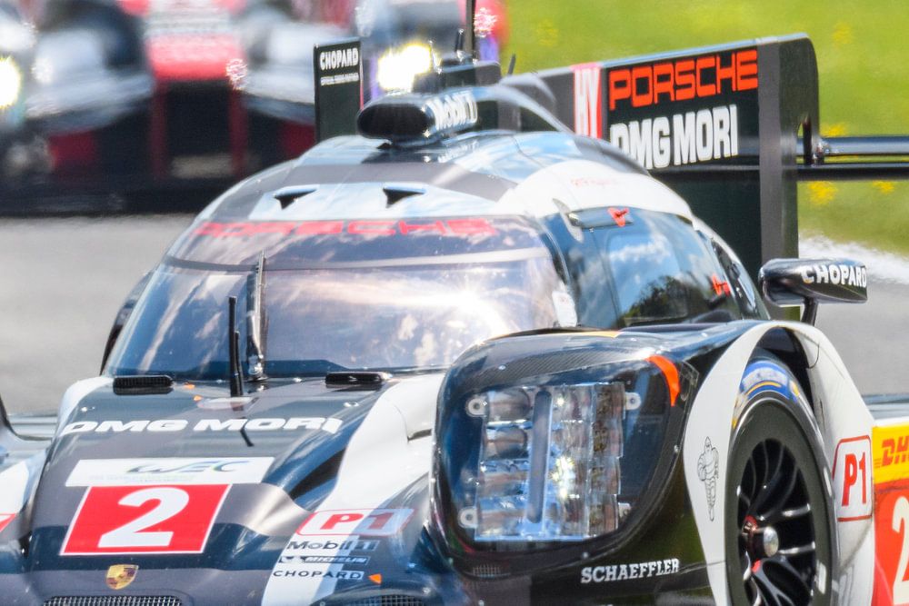 Porsche 919 Hybrid Sport-Prototypen-Rennwagen von Romain Dumas, Neel Jani und Marc Lieb auf der Strecke mit einem Audi Sport Team Joest R18 e-tron quattro Le Mans Prototype Rennwagen im Hintergrund während des 6-Stunden-Rennens von Spa-Francorchamps, dem zweiten Lauf der FIA World Endurance Championship 2016 in Francorchamps.