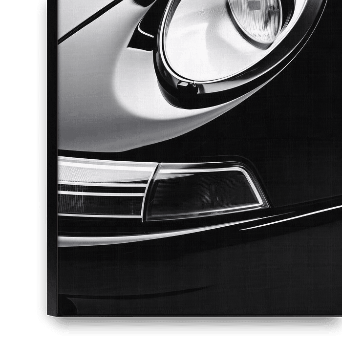 Bestelle das Foto Porsche Close-up - Minimalistische Zwart-Wit Kunst von Surreal Media als Reproduktion auf Leinwand, Alu-Dibond, als Poster, Fototapete oder Acrylglasbild.