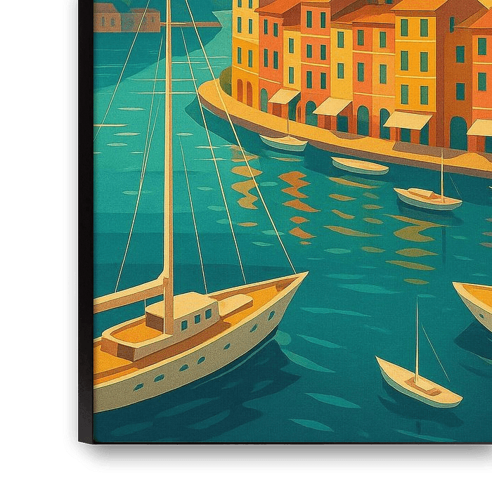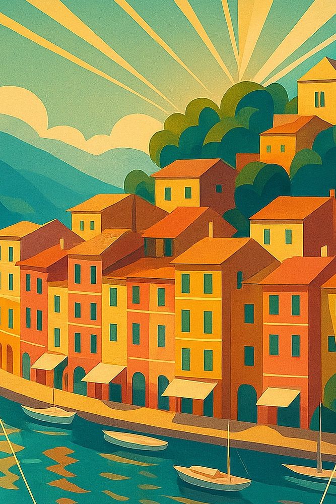 Dieses Art-Déco-Poster von Portofino fängt den Charme eines der glamourösesten Häfen Italiens wunderbar ein. Portofino liegt an der ligurischen Küste und ist berühmt für seine farbenfrohen Häuser, Luxusjachten und die malerische Schönheit des Mittelmeers. Das Kunstwerk verwendet kühne Linien, strahlende Sonnenstrahlen und satte Farbtöne, um die Lebendigkeit dieses Juwels am Meer zu unterstreichen. Das im Stil eines Vintage-Reiseposters gestaltete Bild strahlt sowohl Nostalgie als auch Eleganz aus und ist damit das perfekte Wandbild für Liebhaber der italienischen Riviera. Dieses Portofino-Motiv eignet sich ideal für Heimdekorationen, Büroräume oder Küsteninterieurs und verleiht jeder Umgebung einen Hauch von Raffinesse und Fernweh. Mit seinem Gleichgewicht aus Art-Déco-Stil und natürlicher Schönheit ist es ein zeitloses Stück für Sammler, Reisende und Designliebhaber. Ob Sie nun Erinnerungen an Portofino aufleben lassen oder einfach nur von einem Besuch träumen, dieses Kunstwerk ist eine visuelle Feier des italienischen Küstenlebens und des raffinierten mediterranen Charmes.