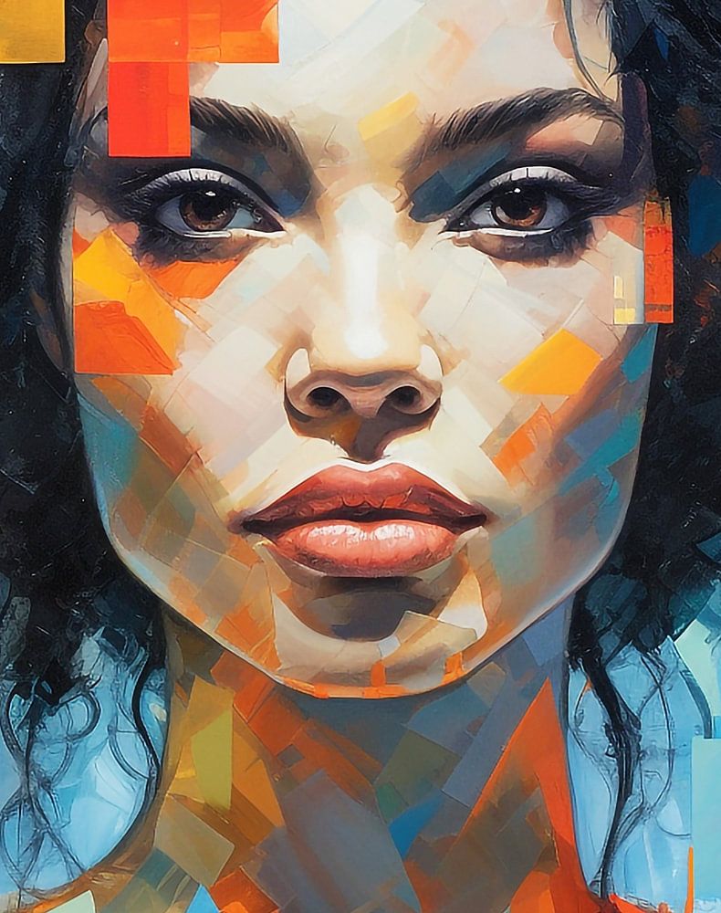 Das Gemälde scheint eine Geschichte von Widerstandsfähigkeit, Stolz und der Suche nach Identität zu erzählen. Es zeigt eine starke Persönlichkeit, umgeben von symbolischen Elementen, die ihr kulturelles Erbe hervorheben. Die ausdrucksstarken Augen der Dargestellten laden den Betrachter ein, tiefer in ihre Seele zu blicken und den Reichtum ihrer Erfahrungen zu entdecken.