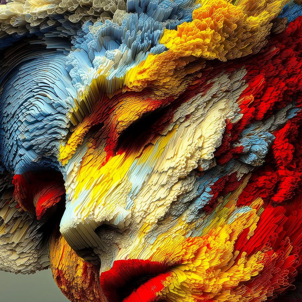 Dieses faszinierende Kunstwerk scheint zwischen Malerei und Skulptur zu schweben, wobei ein menschliches Gesicht auf dynamische Weise zum Leben erwacht. Das Porträt setzt sich aus Hunderten von fast organisch anmutenden Strukturen zusammen, die an Pinselstriche, Federn oder korallenartige Formen erinnern. Diese Elemente verschmelzen zu…