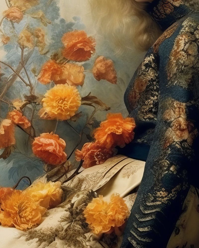 Neoklassisches Porträt einer blonden Frau, umgeben von Blumen. Ein außergewöhnliches Werk, das am besten in einem großen Format zur Geltung kommt. Es ist wirklich ein Statement!