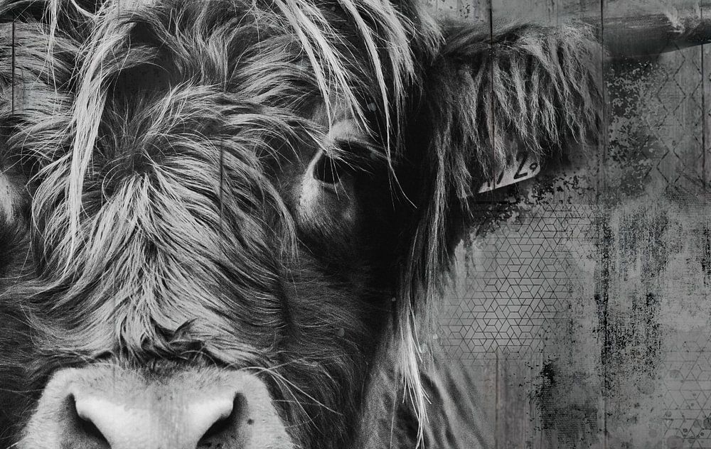 Ein hölzerner Hintergrund, ein bisschen eine Mischung aus einem Pop-Art-Stil, mit Grunge-Elementen. Hart und rau. Es gibt eine Menge zu sehen. Das Foto wurde im Scharreveld (bei Westerbork, Drenthe) im Oktober 2020 aufgenommen. Ich habe die Verarbeitung später hinzugefügt. Die Kuh ist auch ohne Änderung in meinem Shop erhältlich. Schauen Sie in das Album Tiere.