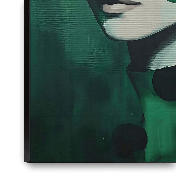 magisches Gemälde, das eine Frau in grünen Pinselstrichen mit großen grünen Tupfen darüber zeigt. Die Punkte ihres Kleides scheinen als Spiegelungen in ihr Gesicht zurückzukehren. Die dunklen Töne machen das Werk stilvoll und geheimnisvoll.