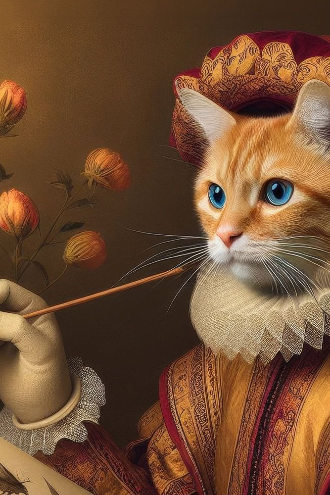Dies ist ein digitales Bild von einer Katze mit Renaissance-Kostüm. Die Katze malt. Die Farben in diesem Bild sind warm.