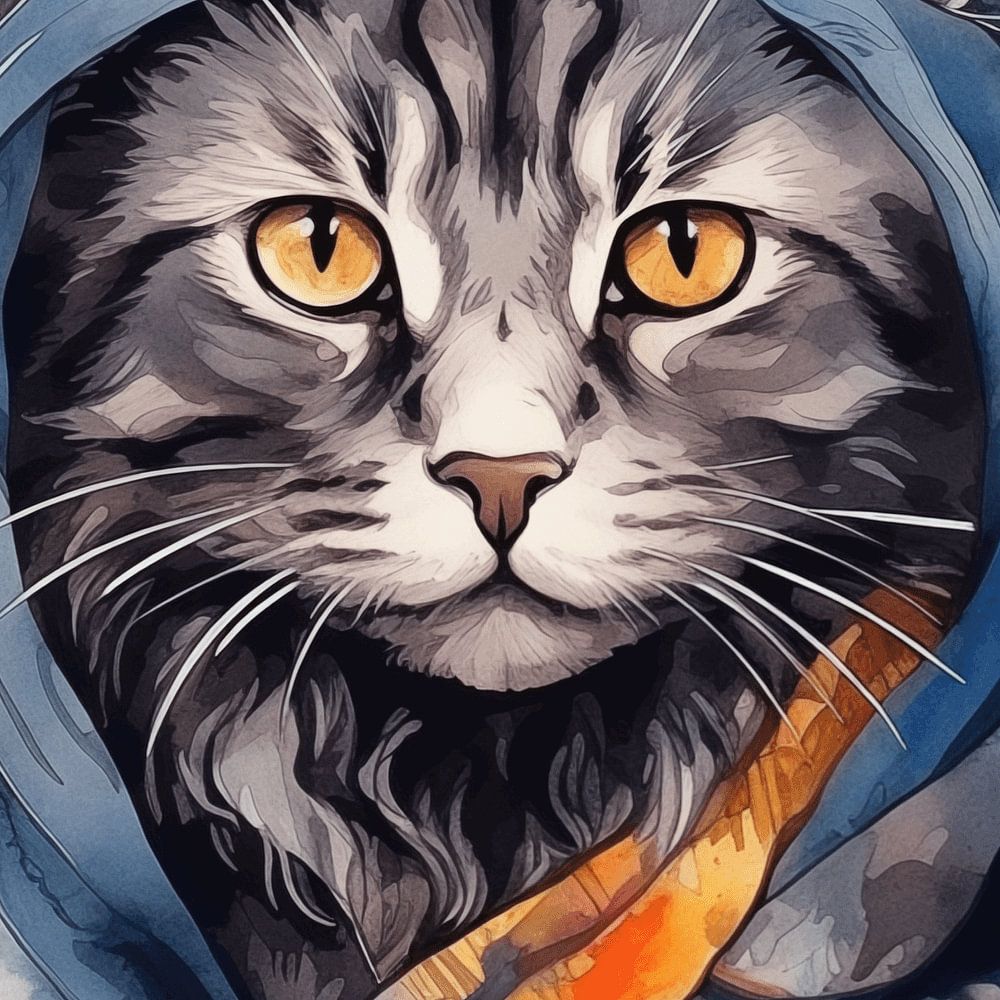 Porträt einer Katze in Wasserfarbe gemalt mit Buntem Kopftuch auf weißen Hintergrund
