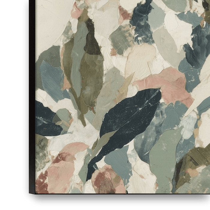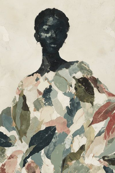 Elegante Porträtsilhouette, verziert mit einer Collage aus botanischen Blattmustern in Salbei, Rosa, Blaugrün und Terrakotta. Sanfter cremefarbener Hintergrund mit Mixed-Media-Textur und goldenen Akzenten.