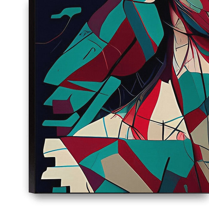 Ein auffälliges Vektorkunst-Porträt einer schönen weinenden Frau, das aus abstrakten geometrischen Formen in leuchtenden Rot- und Grüntönen besteht. Der dunkle Hintergrund verstärkt den hohen Kontrast, während detaillierte Gesichtszüge, scharfe Kanten und kräftige Schatten Tiefe und Emotionen hinzufügen. Dieses hochauflösende Kunstwerk…